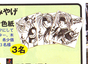 話を元に戻します。プレイステーションが発売されて「アルナムの牙」もリニューアルされて発売、その続編の「アルナムの翼」が発売する前に偶然その当時、一時期購読していた雑誌「じゅげむ」(今は休刊)に発売元の「ライトスタッフ」の訪問インタビューというコーナーがあり、そのプレゼントとしてこのイラスト付サイン色紙(計三名様)があったのです。