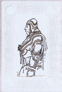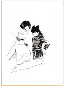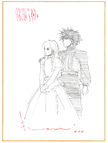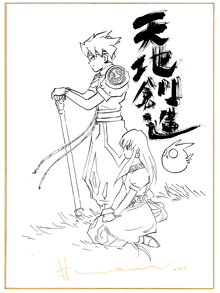 2009年9月7日 藤原カムイ個展『50ANN』にて ロト紋より〜アルス&ルナフレア 「下手にポーズを取らせるから 変になる。普通に描こう。」 ということで思わぬ展開と共に2枚目。 ルナフレアは 長いこと描いていなかったので 服とか忘れていたそうですが、 見事に描きあげて下さいました。 知人O氏、羨ましい!! |