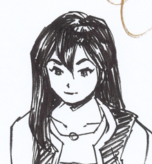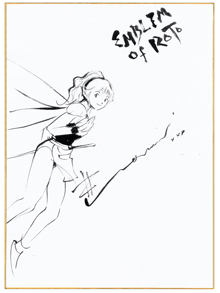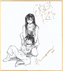 | 2009年9月2日か5日(うる覚え) 藤原カムイ個展『50ANN』にて ロト紋より〜キラ&ヤオ 今回いつもと違い10分くらい掛け 描いて下さいました。 描いているとき、 自分は石化して見ていました。 近くで見るとサインではなく原画と 言われても 不思議じゃない出来です。 ちなみに今回、キラを描いてもらったことで 3勇者、3ケンオウの全員 描いて頂けたことになります。 |