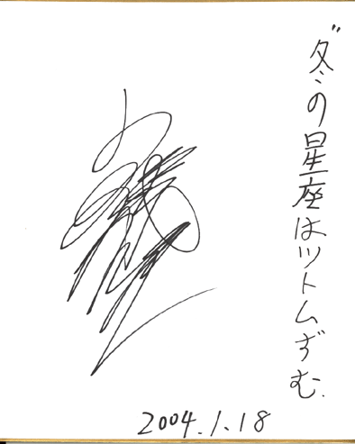 前回から半年後に書いた色紙。「冬の星座はツトムずむ」とは・・・また意味不明なことを書いたものです。ネタ切れですね、ネタギレ。この色紙もツトム(実名)という人がいて、きっと星のように手が届かない人物ということを示唆したのでしょうか、このような名言が生まれたようです。