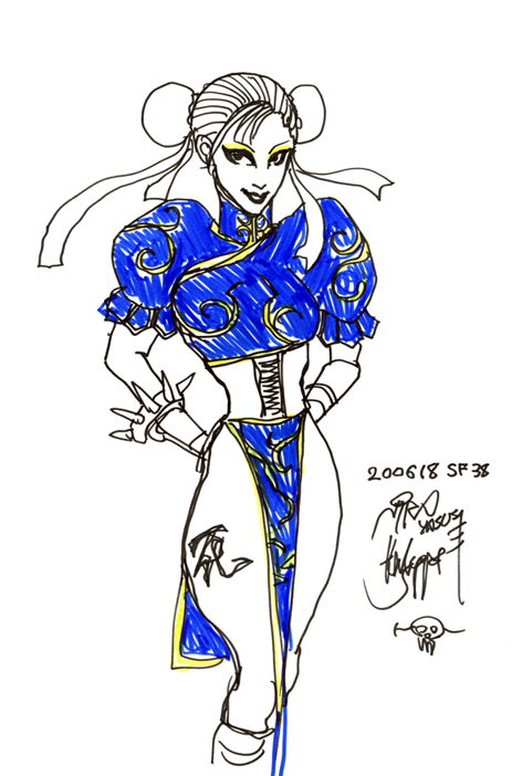 春麗のイラストです。いやホント無理な注文してスイマセンです。 1時過ぎくらいに人の波も収まったので韮沢さんのところへ挨拶へ。また3時くらいに来ることを伝えまたお店に。 その方々のサインを終わると、韮沢さんが声を掛けてくださったので、いつも通り裏に周ってサインを頂くことに。 正直言って今回も寄せ書きのほう何を描いてもらうか全く考えておらずマタマタ韮沢さんに失礼なことをしてしまいました。ホントスイマセン。 で、ヘドラを描いてもらった後に「今回は前にモリガン描いてもらったんで今度は春麗お願いしたいんですけど」と私。そうしたら 最後に色を塗り、目を少し修正されてたんですが、それでかなりいい感じに仕上がりました。だから「最後に挽回した」と言っていたことが背景にあります。