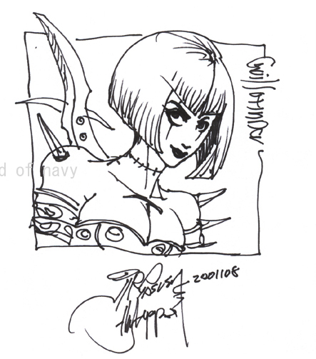 韮澤靖さんの『ギロチーナ』イラスト入りサイン色紙です。このサインは2001年10月8日に開催されたスーパーフェスティバル22(スーフェス)でいただきました。韮澤さんは毎回このスーフェスにブースを設けていて、ご自身が必ずいらして運営なさっています。前回のスーフェスでもいらしていてこの時もギロチーナのイラストを描いて頂きました。今回も何を描いてもらおうか家でも考えていたのですがなかなか決まらず、さんざん迷ったあげく決めたのは前にも描いてもらっているギロチーナの横向きでした。前回頂いた色紙も素晴らしかったのですが、素晴らしいだけにこのキャラの横顔バージョンが見たく、とても捨てがたいと思いこれに決定しました。