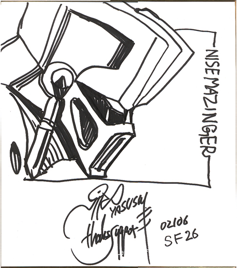 今回は『マジンガー』を描いてもらいました。いつもそうですけどサイン会とかではないので色紙に絵を描いてもらっている人ははっきり言って私しかおらず、ブースの裏で座りながら時間をかけて描いて下さいました(私も裏で座らしてもらって待っていた)。書いている最中「なんか違うなぁー」と連発して言っており、そう言っていたとおり最終的には「ニセマジンガー」となって色紙を渡されました。ちょっとレアかな?