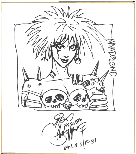 で、肝心の韮澤さんのサインはそんな中、ちょっと落ち着いた2時半ごろ店を抜け出してもらって来ました。「コンニチハー」と言った瞬間「おぉー来たナー」と言われて早速店の裏に座ってまずは寄せ書きのほうを書いてもらい、その後に上の画像のNINA・DOLONOを描いてもらいました。そういえば散々描いてもらっているくせにNINAは描いてもらったいないことに気付いて描いてもらいました。