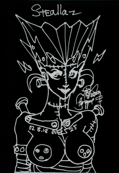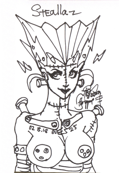 寄せ書き2人目はコミックアーティストのヒロモト森一氏とコンビを組み、そのキャラクターデザインを勤める韮澤氏。その漫画のヒロインStealla嬢を描いてもらいました。もらった2002年8月18日現在まだ連載はされていないので描いてもらっているときどんなキャラが出てくるか楽しみに見ていました。