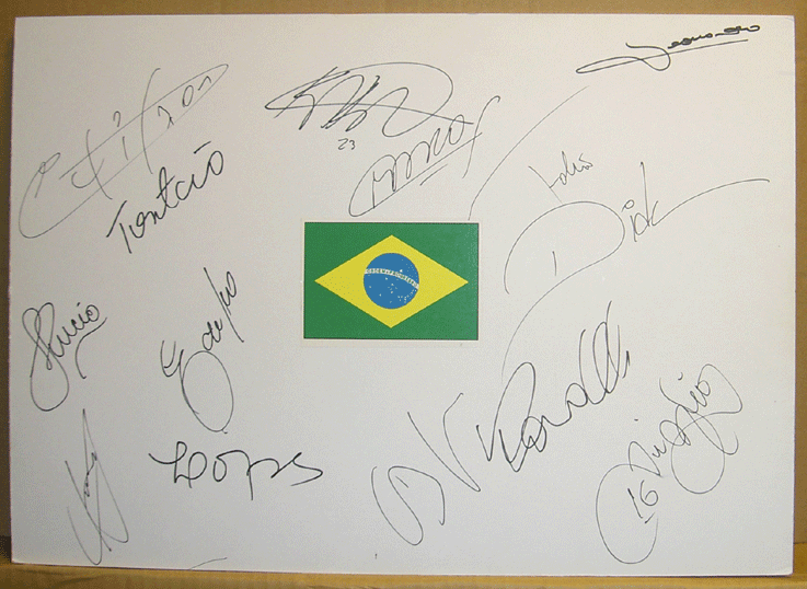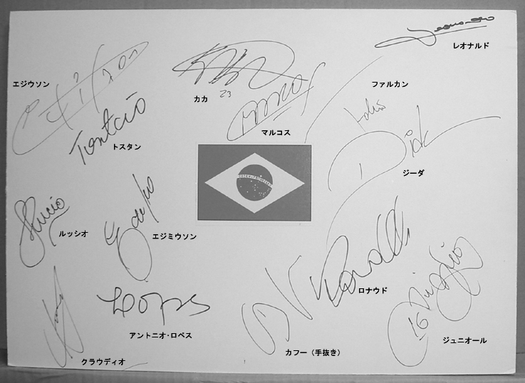 2002.6.28. 『ロナウド』『』『カフー』『エジミウソン』『ルッシオ』『カカ』『ファルカン』『クラウディオ』 神奈川県横浜市内のホテルにて入手。『ルッシオ』『カカ』は3階で、ロナウド、カフー、エジミウソンは二階で、 ファルカン、クラウディオは一階でもらう。 |