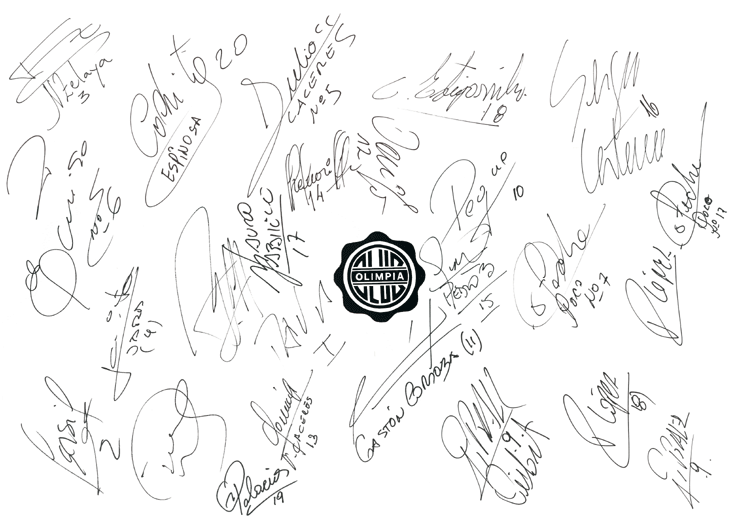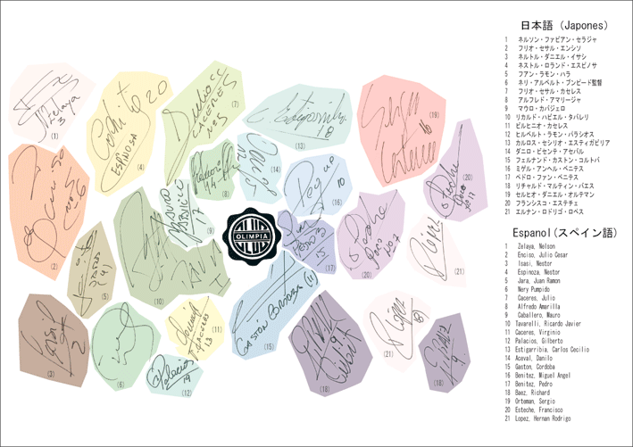 この寄せ書きは2002年11月26日〜12月2日までの間、計4日間横浜市内のホテルに通って集めました(集まったのは3日間で)。その期間相手チームのスター軍団「レアル・マドリード」の宿泊している浜松町のホテルにも行きましたが、ファンの数は雲泥の差。オリンピアのホテルにファンは私一人というときもありました。レアルのホテルは昼時、100人以上が常時いたのに対し、オリンピアのホテルは一日にファンの数が5人くらいでした。警備員の数も浜松町のホテルは3〜40人に対しこちらは0人…。そのせいかとても温かみのある和やかな雰囲気で、選手がロビーでくつろいだり、結婚式を見て一緒に祝福し拍手していたりと、私が言うのもなんですが本当にあり得ない光景が当たり前のように過ぎていました(私も何故か結婚式に立ち会って拍手していたし…)。もちろんサインをもらうときも快く応じてくれて、ほとんどの選手は時間をかけてゆっくり書いてくれ、中には私一人のためにソファーに座ってじっくり書いてくれる選手もいました。そのため本当にきれいなサインです。