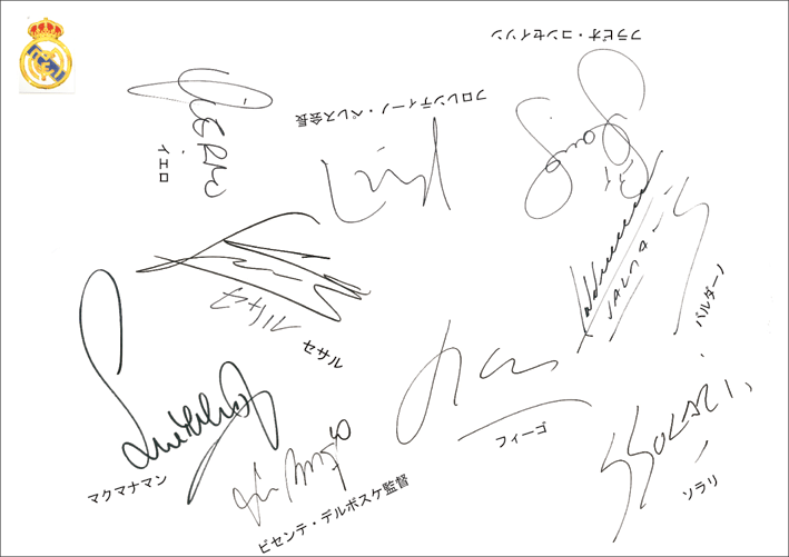 2002年12月3日に行われたサッカークラブチーム世界一を決めるトヨタカップの欧州代表レアルマドリードの寄せ書きサインです。これだけ集めるのにとても苦労しました。私はオリンピアのホテルにも足を運んでいますが、警備体制もファンの数も雲泥の差でホテルの警備も40人くらいいました。ファンも多いときで100人は楽に超え、大変な状況の中サインをもらったことは覚えています。マクマナマンやソラリ、セサルはとてもいい方で、ファンが寄り付かなくなるまでサインをし続けていました。意外だったのがフィーゴ。私の勝手な偏見だったのですが、けっこう気難しい人かと思っていましたが、いざふたを開けてみるとほとんどの選手がサインしない場所でもフィーゴ選手が率先して一番多くサインをしていたのは本当にびっくりしました(私が見たのはホテル到着時)。ペレス会長もかなりいい人で、サインを求めるファンに対しホテルの人が止めようとしたのですが会長が「別にいいじゃねーか」見たいなことを言ったらしく求めたファン全員に対しサインしたらしいです。