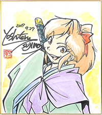 2019年2月10日ワンダーフェスティバル2019冬にて行われたサイン会で主催者をやらせて頂きました。左の色紙はブースの目印用に、右側ヨミの色紙はあるコーナーの展示にて使用し、事前に辻野さんに依頼して描いてもらったものです。ちなみにヨミは友達が持って帰りました。 |