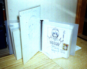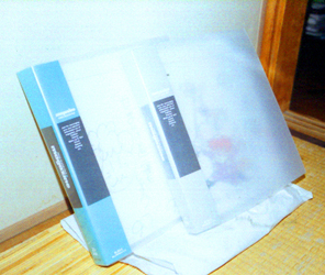 漫画家などのイラストを描く人の色紙は写真のような差し替え式ファイルを使って保管しています。 下の写真にも出てきますが色紙専用ファイルと違い、横から入れるのではなく上から入れるような作りなので、ページをめくったとき色紙がずれたりしないのがいいです。 私が知っている中でこのファイルが色紙入れに一番適しています。 買ったとき本体と一緒にクリアファイルが20枚入っているので追加でファイルはいりません。 KING JIM 社から発売されているキングクリアーファイル「magazine」No.197W A4変型を使用。 |