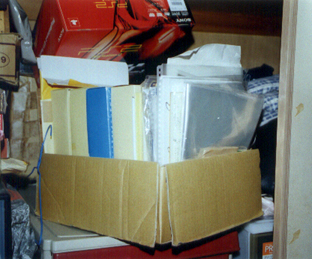 ファイルに収まりきらないほとんどの色紙は写真のようにして保存・・・というか置いてあると言ったほうがいいでしょうか。見て分かるように店で余った『色紙を入れる箱』をもらってきて、それの中に入れています。また、中の色紙はビニールに一枚一枚入れて入っています。 (写真だと分からないが、これの奥にもう一つ同じような入れ物がある) |